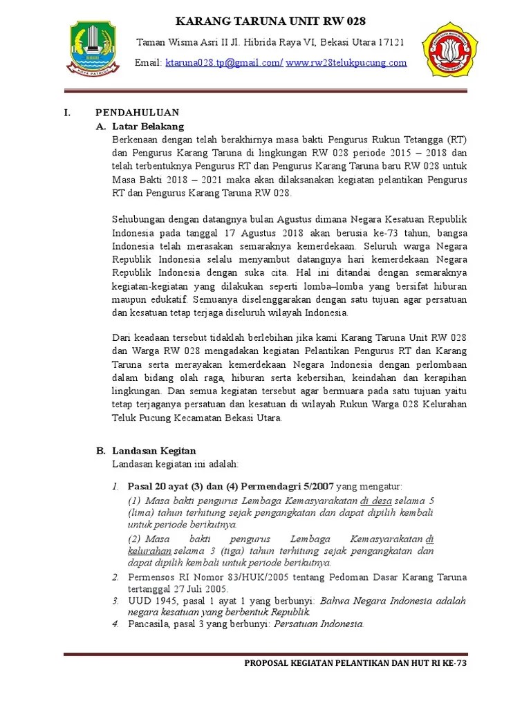 Pramuka mengemas kegiatan kepramukaan dalam sebuah wadah kurikulum . Nama kegiatan kegiatan ini bernama pelantikan dan rapat kerja . Puji syukur dipanjatkan kepada allah swt bahwa proposal pengajuan dana kegiatan pelantikan gabungan pmr smk negeri 7 batam yang akan . Tidak ada postingan yang cocok dengan kueri: Contoh proposal acara pelantikan pengurus organisasi kemahasiswaan/kepemudaan.