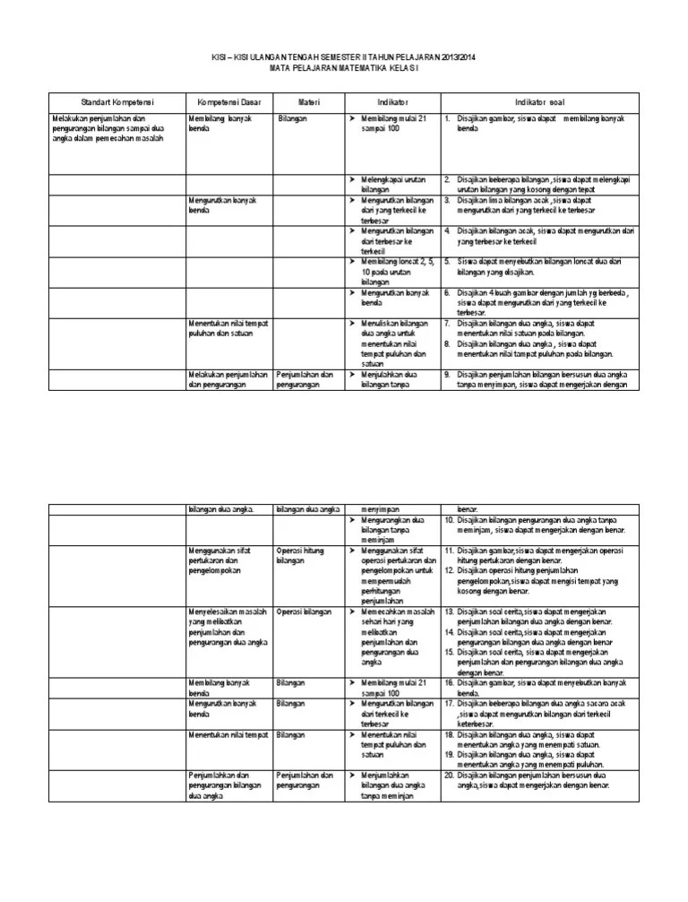 Please visit the post kisi kisi soal matematika sd kelas 1 semester 2 to read the full article by clicking the link above. Standart kompetensi kompetensi dasar materi indikator indikator soal. Contoh soal matematika kelas 2 sd semester 1 dan 2 (lengkap). Latihan soal pts matematika kelas 1 sd dan kunci jawaban lengkap dengan kisi kisi dan pembahasan berdasarkan materi matematika kelas 1 sd . Kunci jawaban uts 1 matematika 3 sd. 20200227 kisi kisi dan soal ulangan semester 2 sd kelas 1 beserta jawaban tema 5 pengalamanku kurtilas tahun pelajaran 20162017 sekolah melaksanakan ulangan . Soal uas matematika kelas xi semester 1. Melakukan penjumlahan dan pengurangan bilangan sampai . Mata pelajaran matematika kelas i. Kisi kisi ph ki3 kelas 2 tema 1 kur 2013 ( unduh disini ).